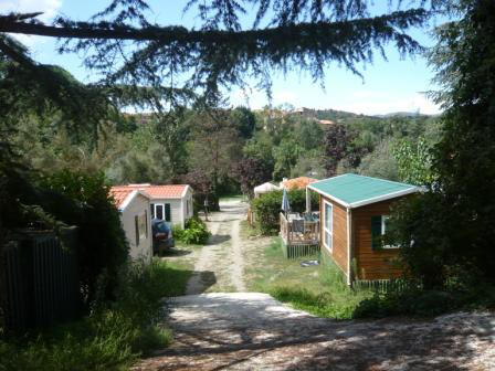 de Franse Pyreneeën, op een hoogte van 300m. Op de camping is een eigen zwemmeer. De kampeerplaatsen zijn vlak met een harde groene ondergrond. Verder staan er een 15-tal volledig ingerichte 4 - 6 persoons stacaravans. |